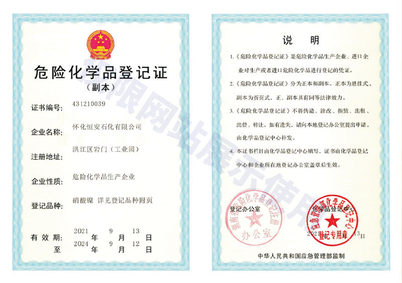 怀化恒安石化有限公司成立于2011年6月,目前是全省唯一的一家专业从事有色金属材料生产硝酸镍等产品生产的化工企业,厂址位于怀化市洪江区工业园区2号。主营产品包括硝酸镍、碱式碳酸镍、碱式碳酸钴、薄水铝石、硝酸钴、硫酸镍、4A分子筛等。